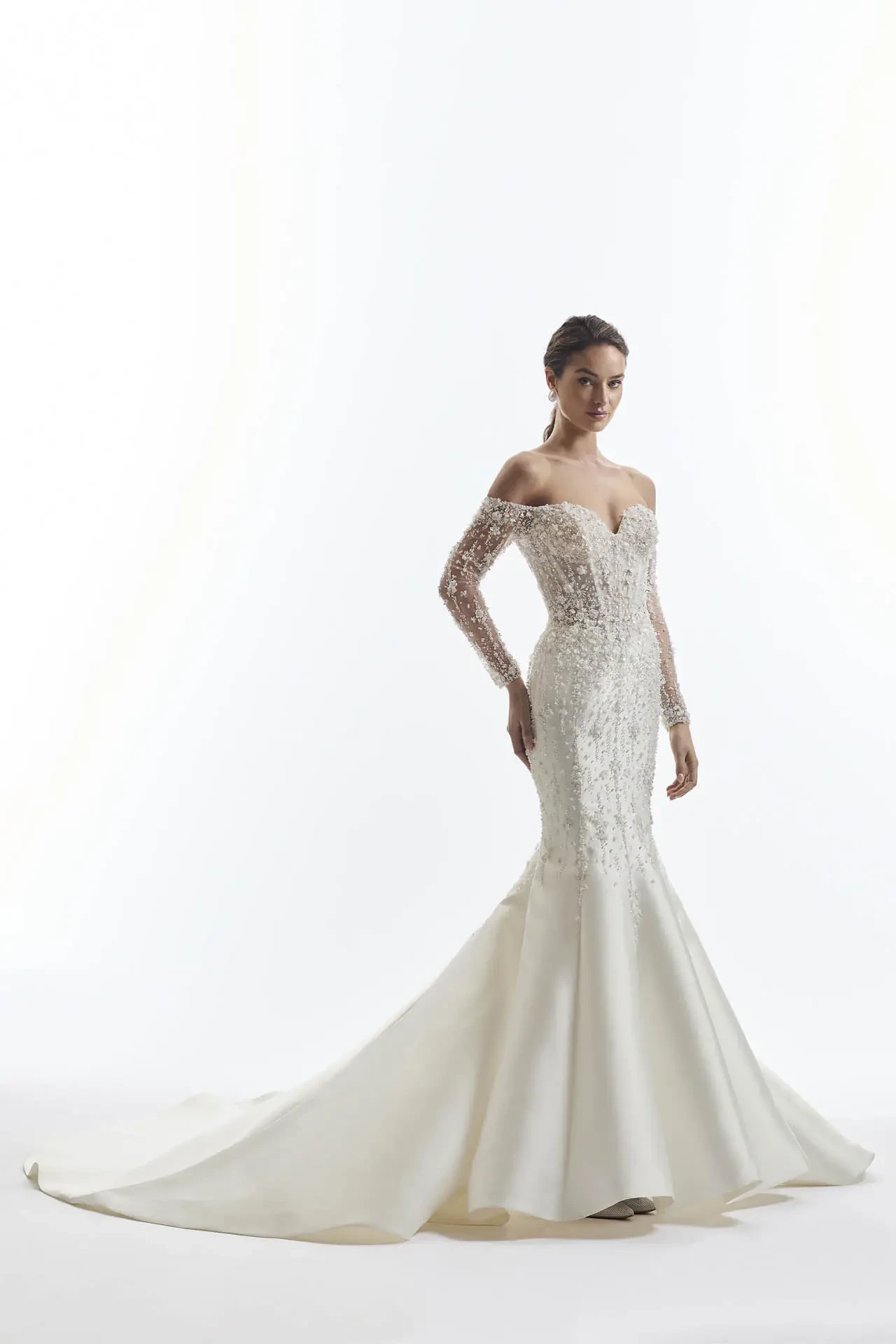 A show‑stopping mermaid gown in luxe dupione, satin, or mikado, AM69 combines sculpted structure with couture embellishment. An off‑the‑shoulder sweetheart bodice and long illusion sleeves are cloaked in three‑dimensional floral appliqués and delicate beadwork, cascading seamlessly into the figure‑skimming skirt. A dramatic chapel‑length train completes the look, with an optional matching SF5 beaded scarf to elevate your entrance.