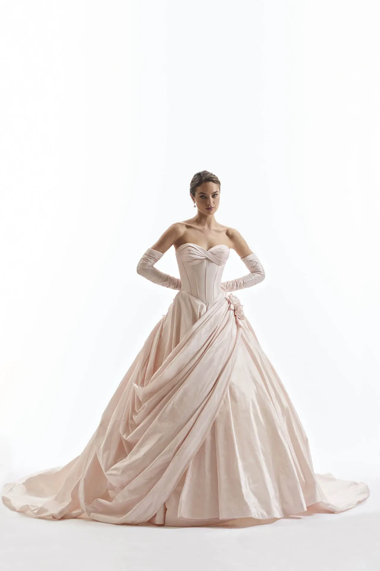 A couture‑inspired ball gown in taffeta, AM75 centers on a sculpted corset bodice with a gently twisted sweetheart pleat that sweeps across the bust and waist. A soft draped overskirt cascades from the hip—secured by a cluster of hand‑stitched roses—over the full chapel‑length skirt. The back features a classic lace‑up corset and matching floral detail. Complete the look with the optional SL133 ruched elbow‑length sleeves—an homage to Grace Kelly in To Catch a Thief—for timeless Old Hollywood glamour.