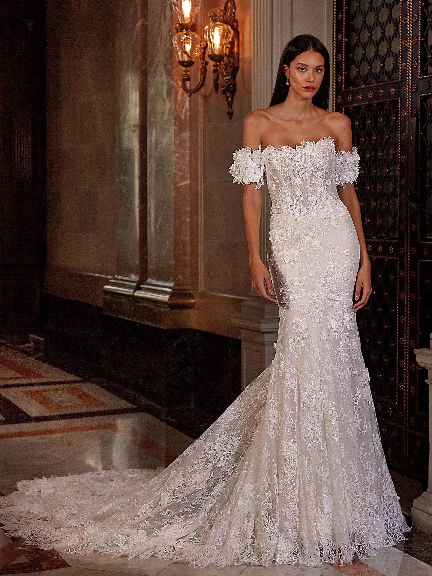 Renata stuns with a romantic, sculpted neckline that frames the collarbones and shoulders in dreamy off-the-shoulder florals. Crafted from exquisite 3D lace and sparkling tulle, this bridal gown features a form-fitting silhouette, intricate floral appliqués, and a delicately laced back that ties the entire look together with vintage charm. Add the matching SL120 sleeves for an ethereal finish.