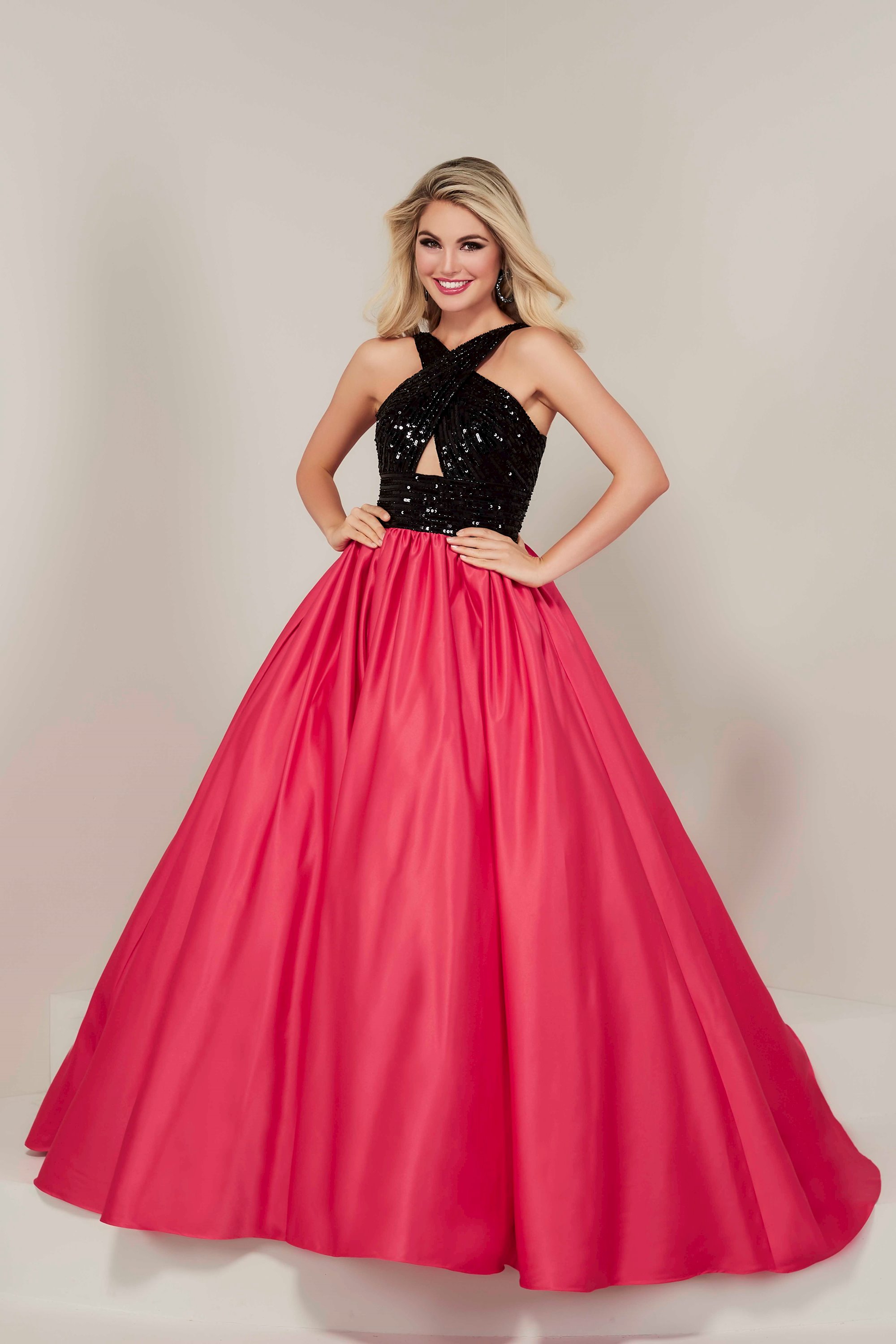 This playful yet elegant strapless gown features a crisp white base adorned with black polka dots in varying sizes, creating a bold and stylish visual effect. The fitted bodice hugs the figure down to the hips, where a decorative petal adds a touch of flair before transitioning into a flared, floor-length skirt.