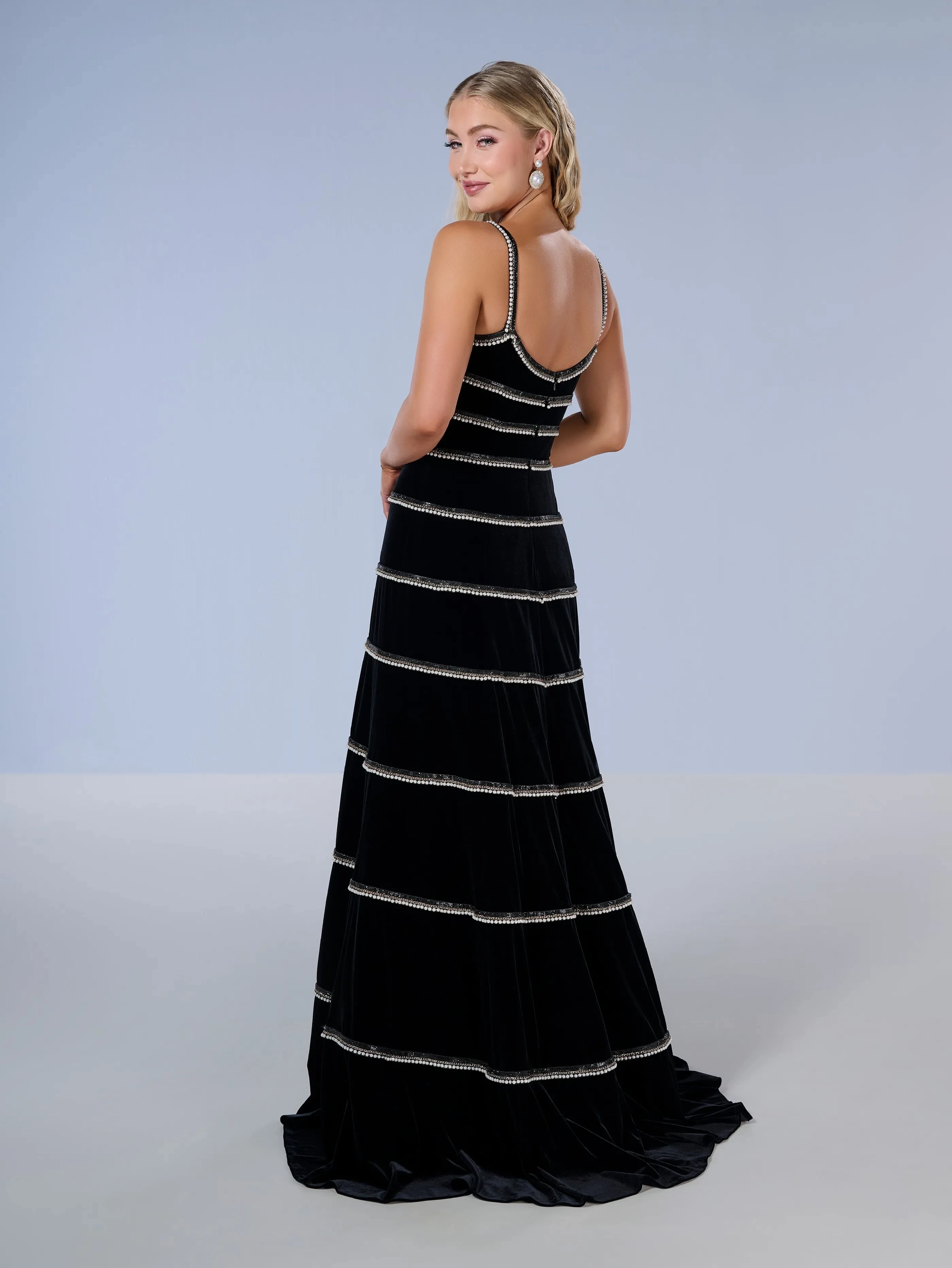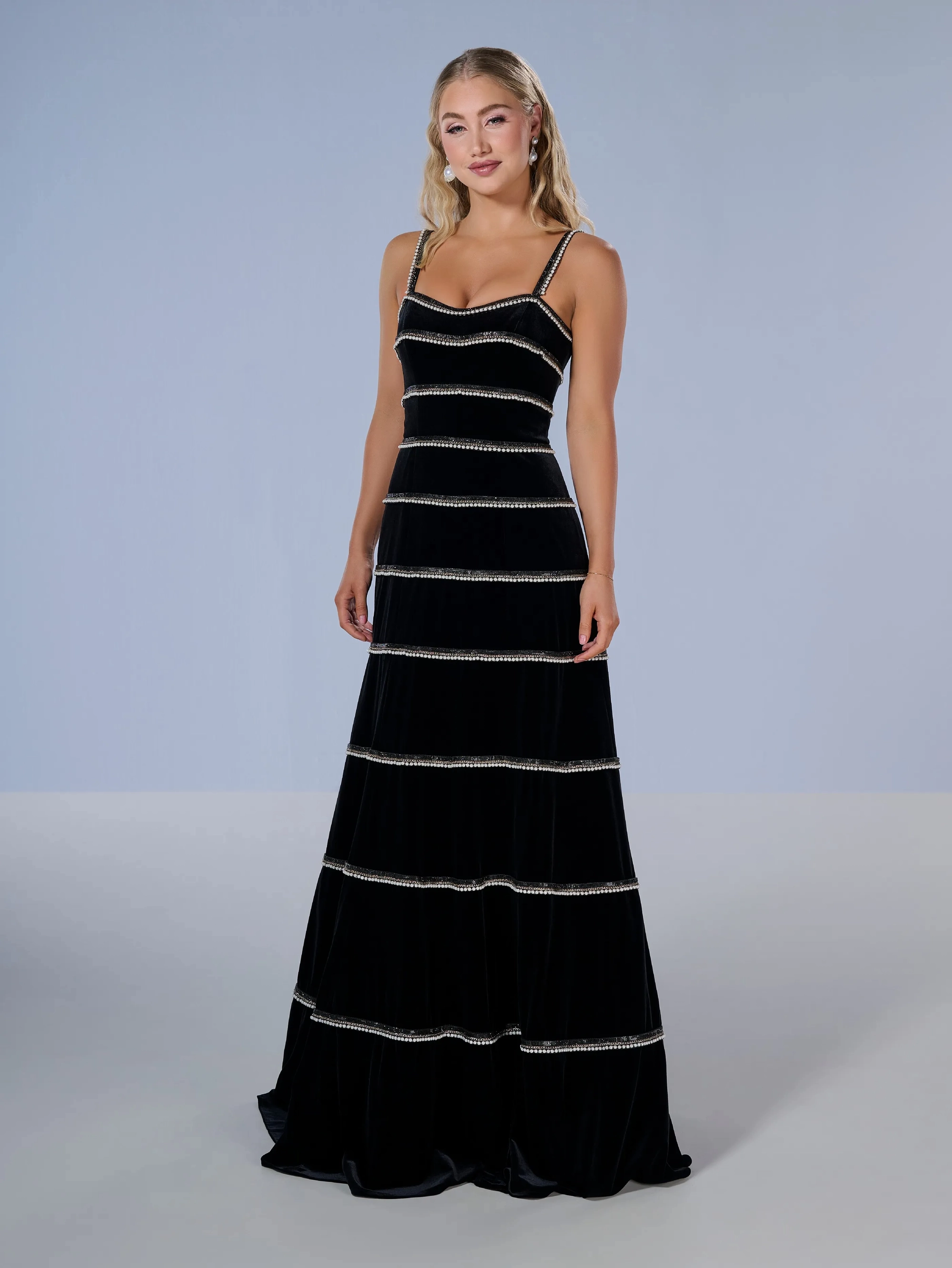 A flawless A-line fitted gown made out of velvet fabric with pearl trim.