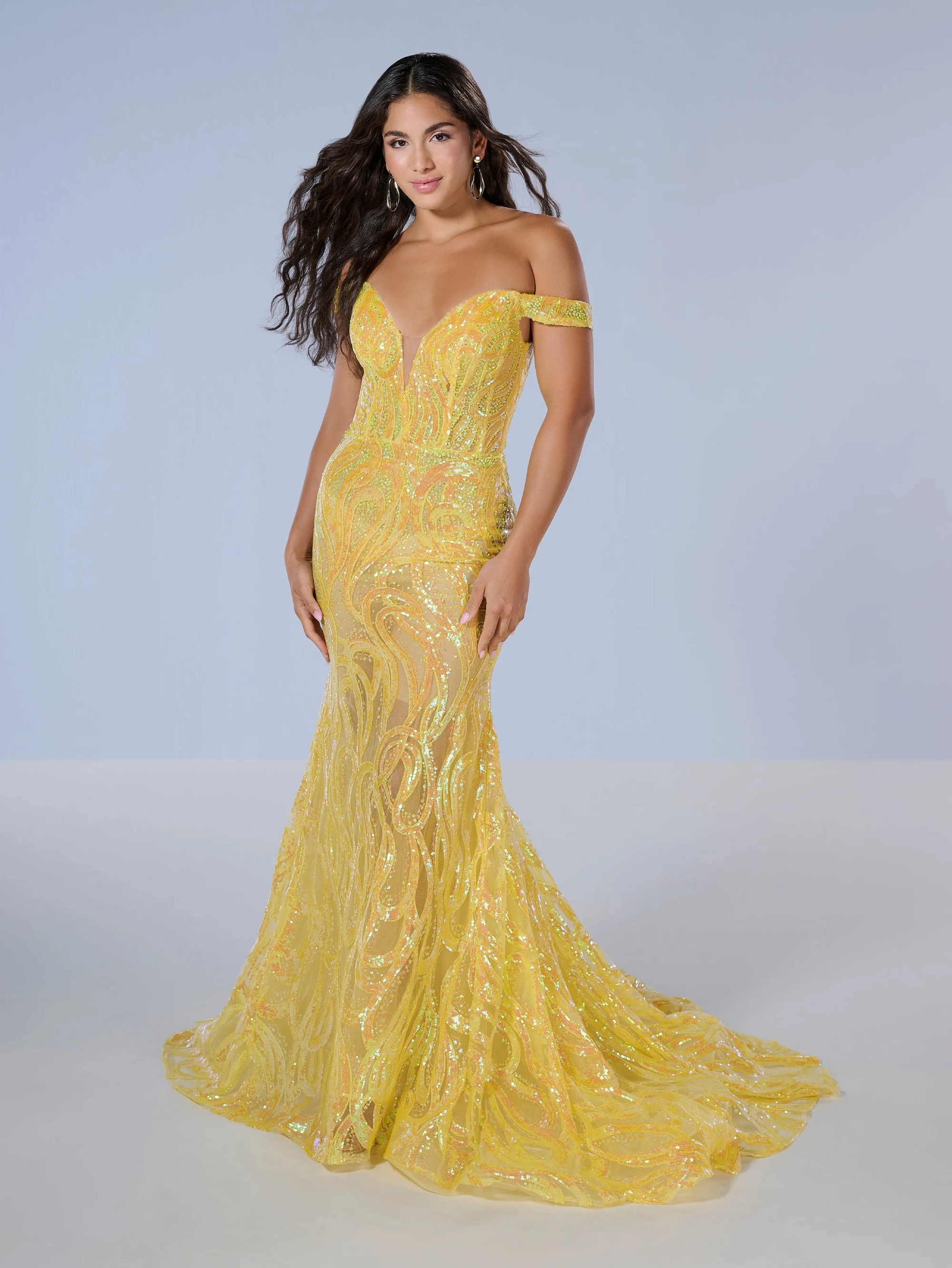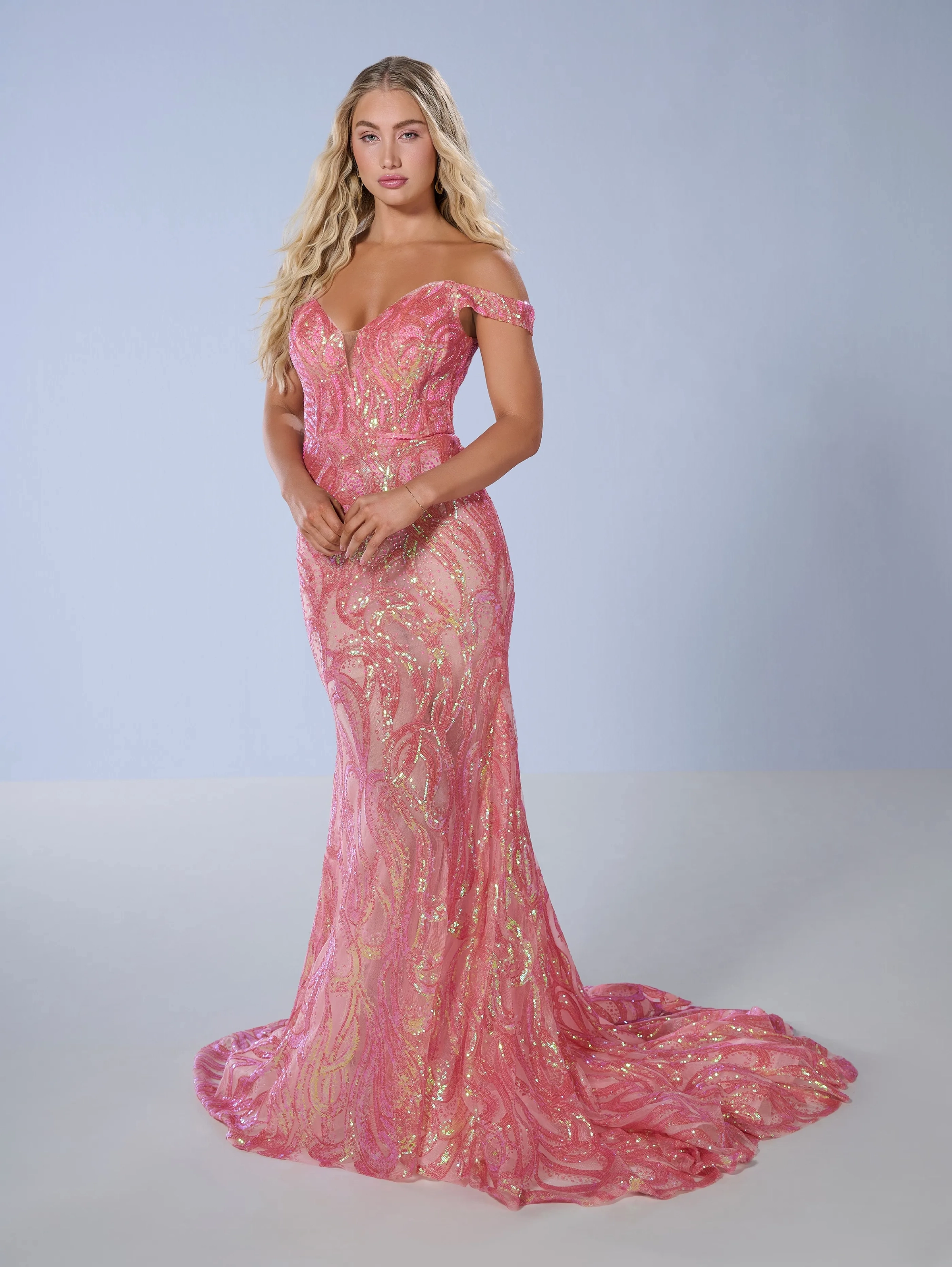 A mermaid fitted gown made out of sequin fabric with an off the shoulder sweetheart neckline, detachable skirt with a sweep train.