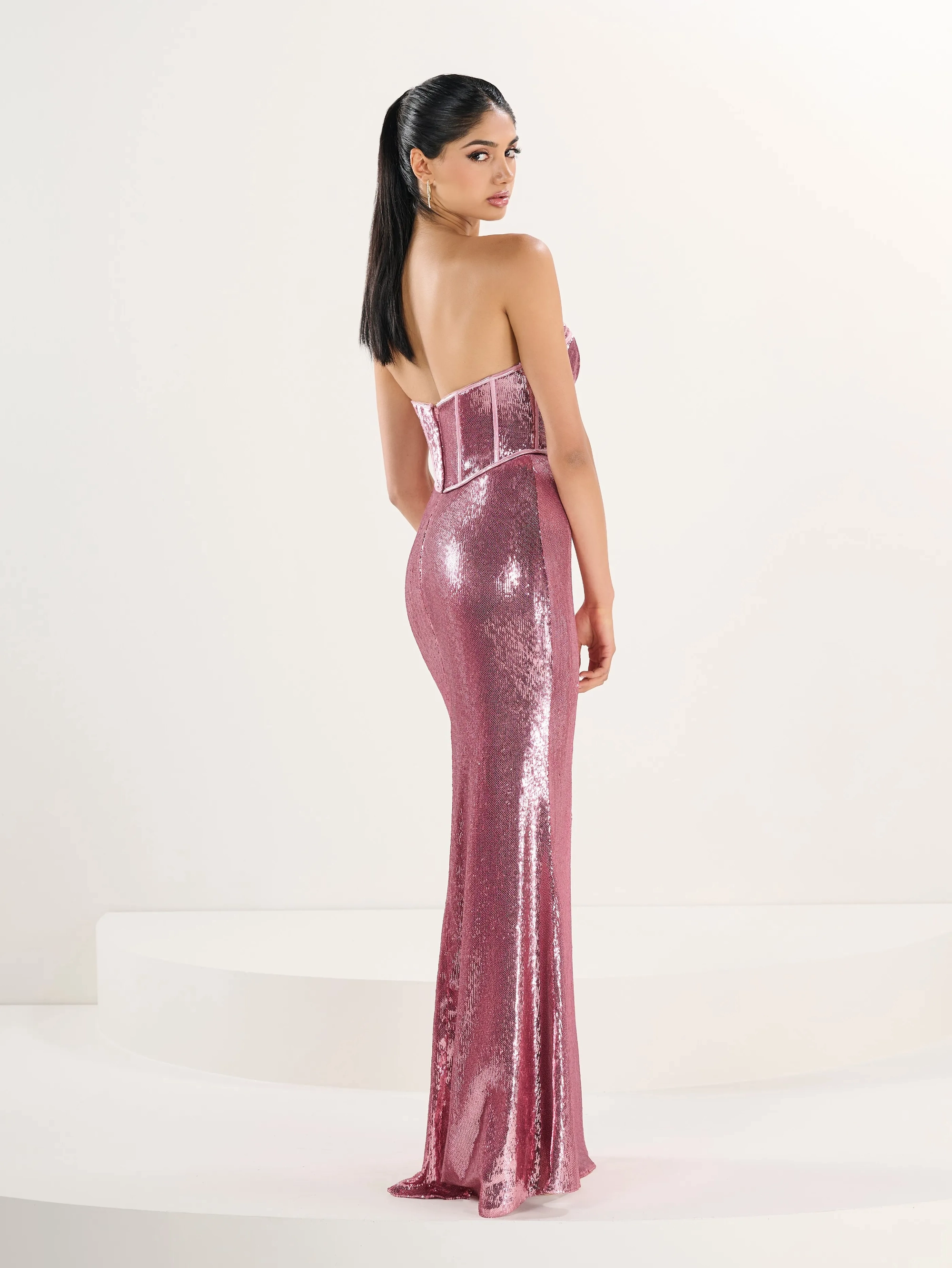 Two pc micro sequin corset with slim skirt & contrast black bow & casings.