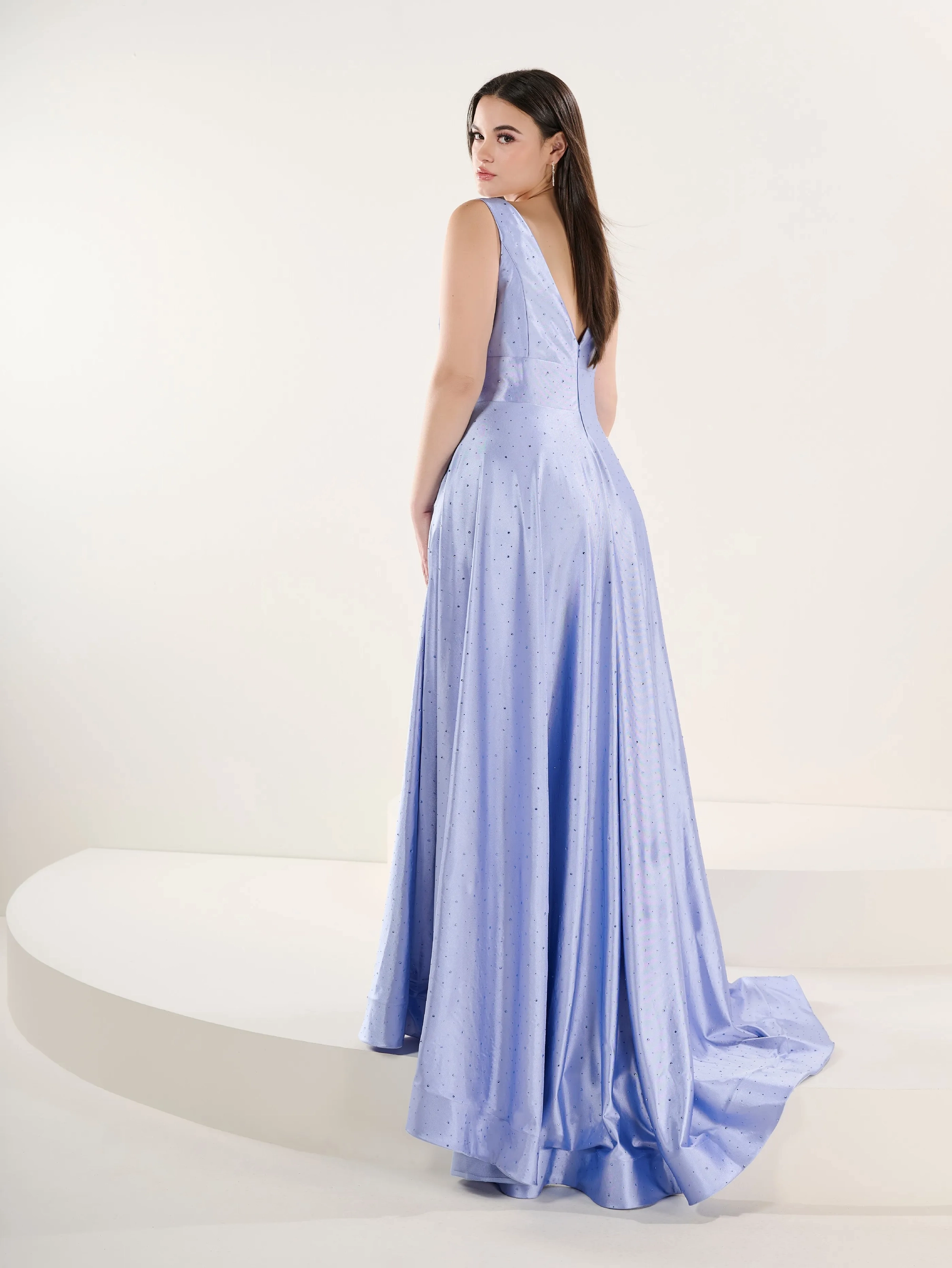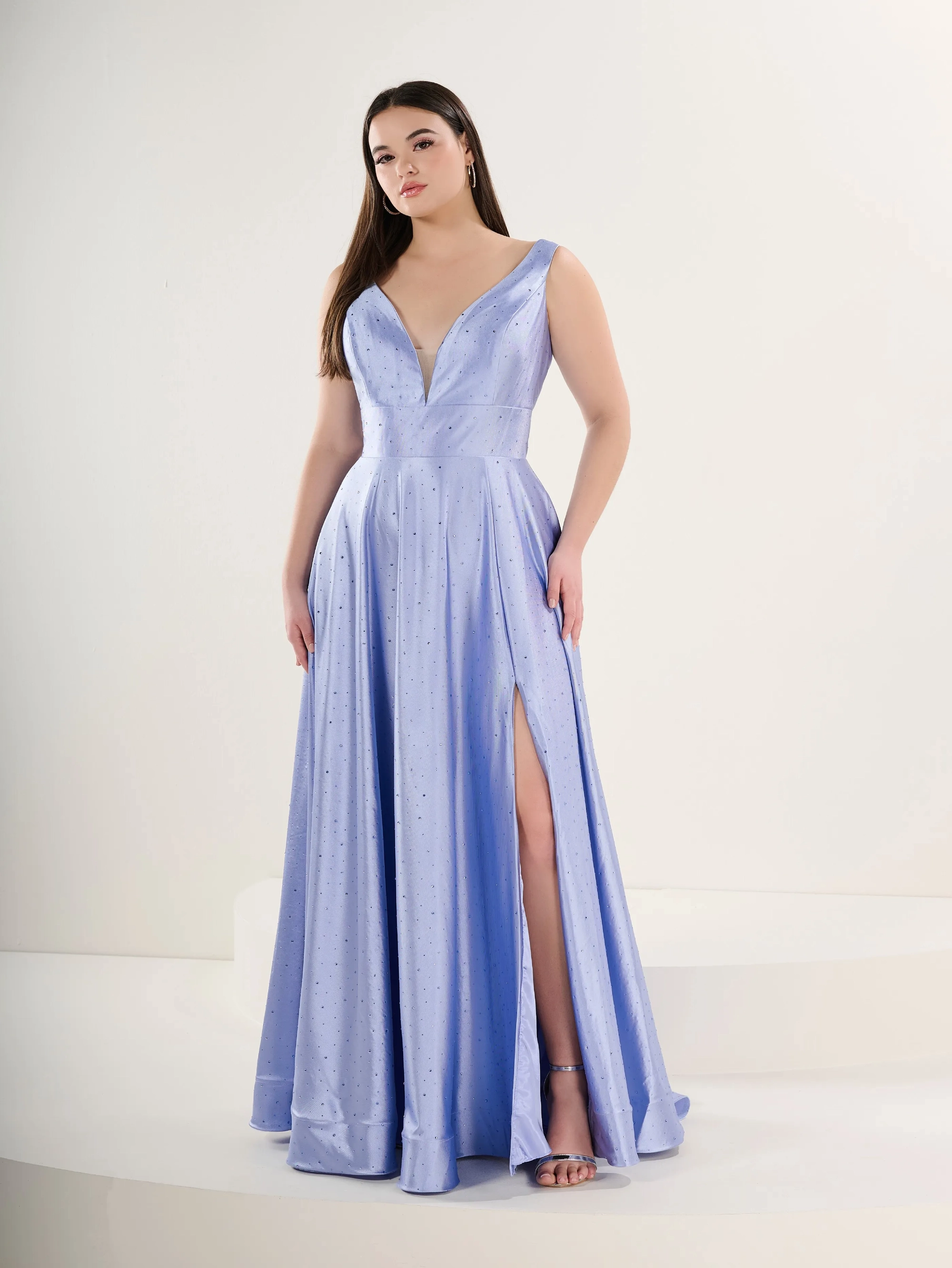This soft and radiant periwinkle plus-size gown offers a fresh take on timeless elegance. Crafted from luxurious charmeuse fabric, it features a plunging v-neckline with modest illusion mesh inset, giving both confidence and class. Subtle sparkling embellishments are scattered throughout the bodice and skirt for a touch of shimmer that catches the light beautifully. The A-line silhouette flatters every curve while the thigh-high slit adds a flirty, modern twist. The back of the gown mirrors the clean lines of the front with a classic v-back and a smooth zipper closure for a seamless fit. The charmeuse flows into a graceful full skirt with a light train, offering both drama and movement.