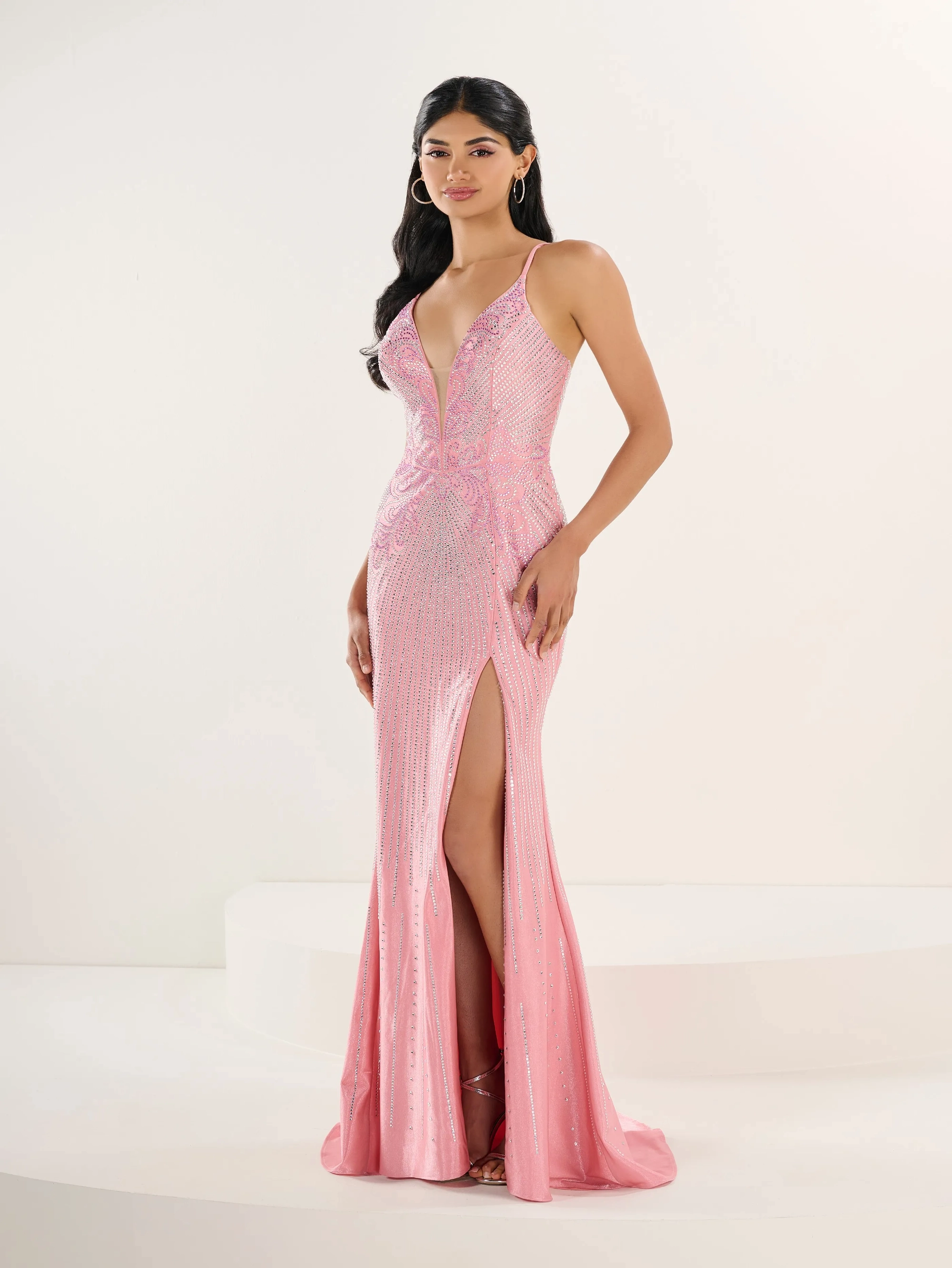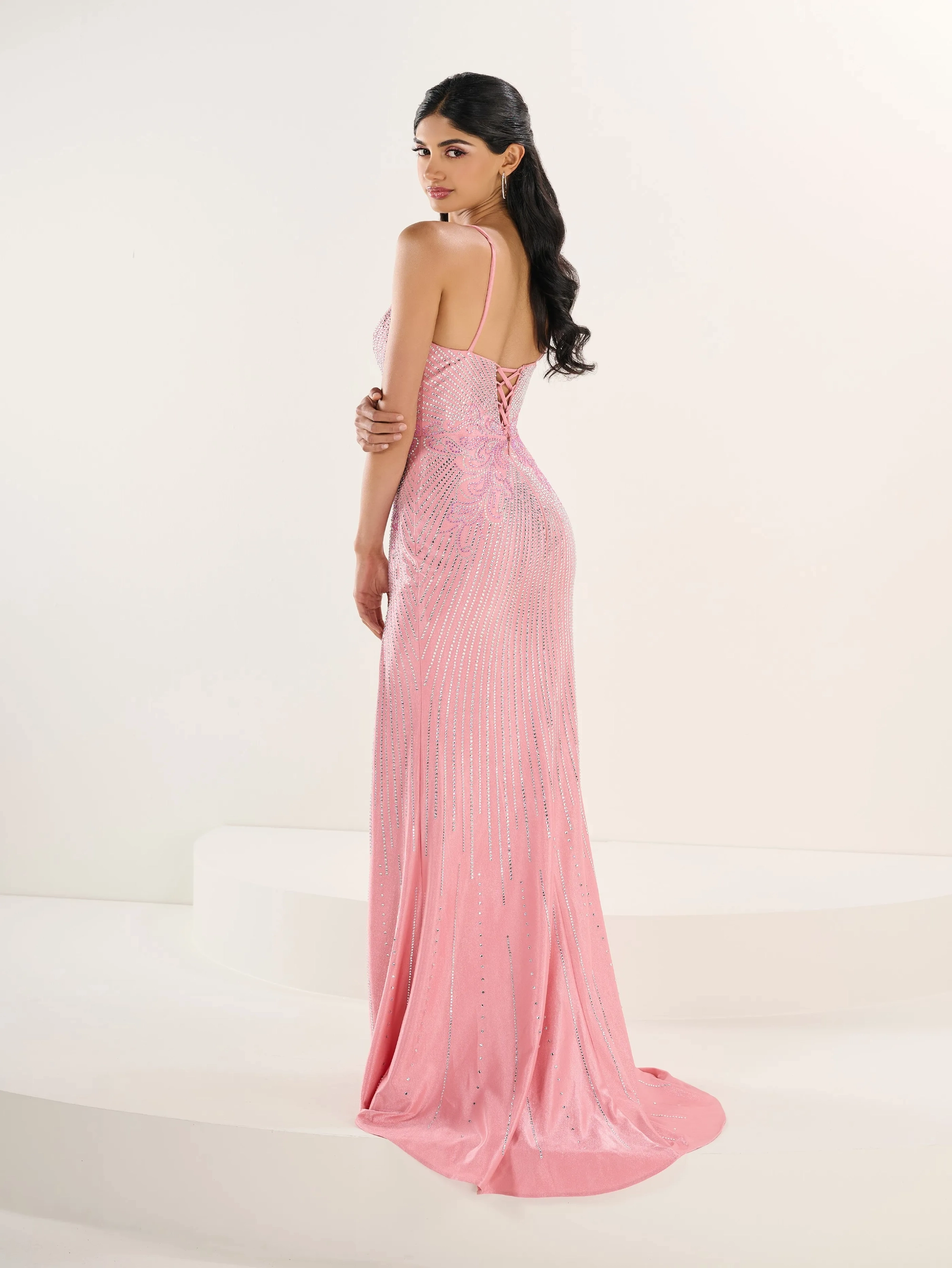 This curve-hugging gown dazzles in shimmer jersey, offering the perfect blend of glam and grace. The deep V-neckline with illusion mesh insert adds drama and elegance, while the bodice is adorned with delicate beaded embellishments that cascade into radiant linear patterns. Subtle floral detailing at the waist highlights the hourglass silhouette, and the thigh-high slit provides movement, allure, and confidence. The back features a lace-up corset design that adds support and shape while allowing for adjustability and comfort.