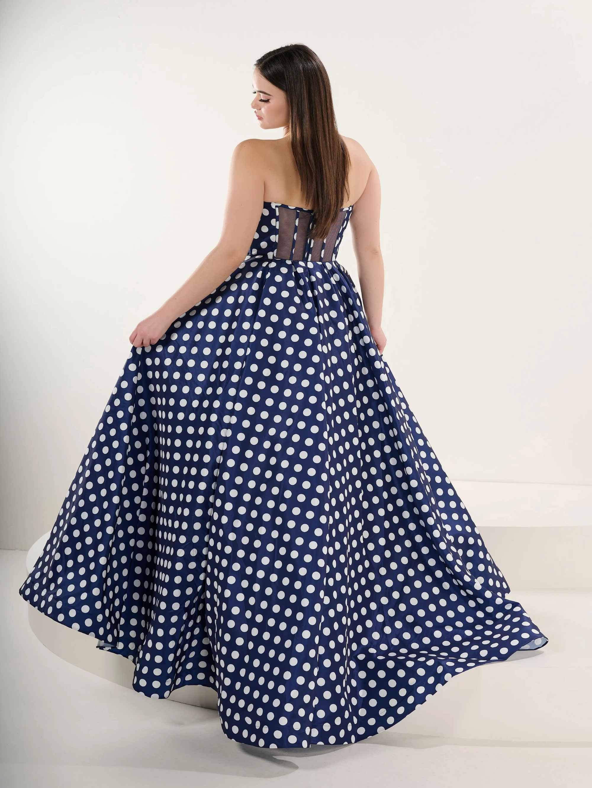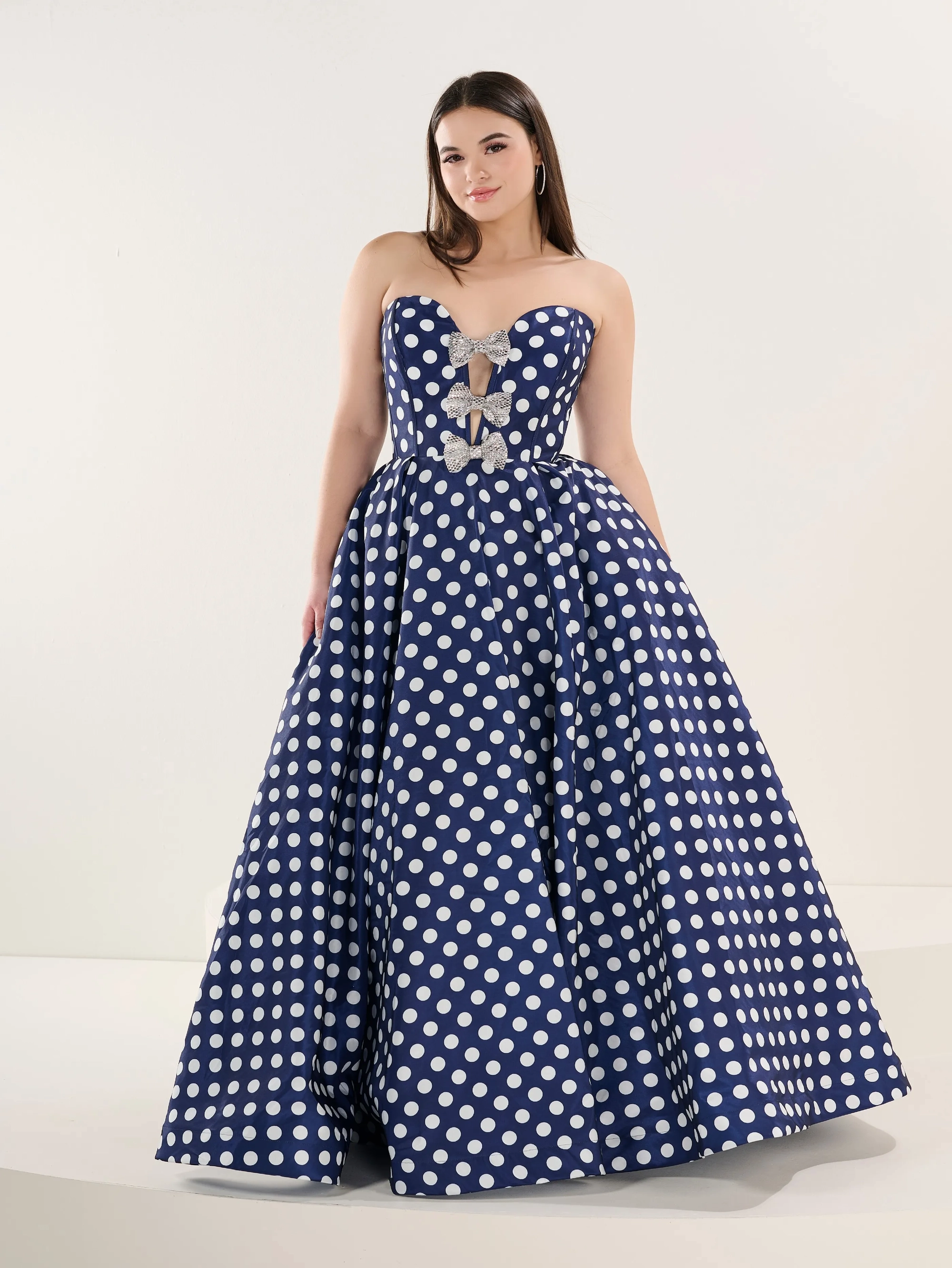 This plus-size ball gown combines retro charm with contemporary detail. The bodice features a sweetheart neckline with polka dots and striking keyhole cutouts, delicately accented by silver crystal bow appliqués. Vertical black piping flatters the torso, drawing the eye inward and creating a beautifully contoured silhouette. The voluminous A-line skirt flows from the waist in rich black organza with bold white polka dots, bringing playful elegance and vintage-inspired flair. The back of the gown features a sheer illusion panel with structured boning that mirrors the front’s tailored shape while offering breathable comfort.